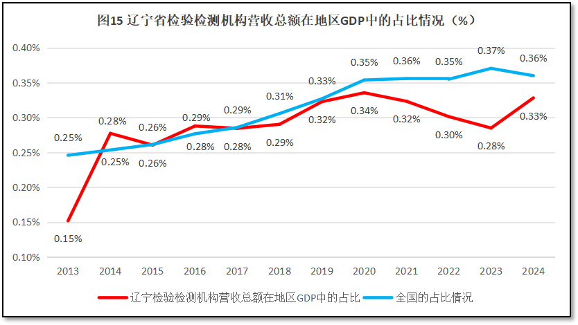 从图15可见,从2014年到2020年,辽宁省检验检测机构营收总额在当地GDP中的占比逐年增长,且与全国平均数十分接近。但2020年之后辽宁省的占比停止增长,连续三年出现下降,同时拉大了与全国平均数的差距,显示出完全不同的发展趋势。2024年,辽宁省检验检测机构营收总额在当地GDP中的占比有较大提升,大大缩小了与全国平均数的差距。