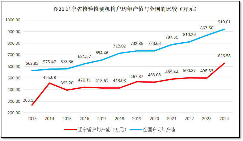 由图20可见,辽宁省检验检测机构户均营收从2013年的266.13万元增长到2014年的455.08万元,之后近10年就基本上没有了大的增长,直到2024年才出现了比较明显的增长,一举突破了500万元、600万元两个关口,达到626.58万元,是2013年的2.35倍。从增长率的曲线来看,除了头两年数据误差导致增长率异常之外,从2016年起,辽宁省检验检测机构户均年产值的同比增幅总体平稳,受2024年度高增长的拉动,2016年以来辽宁省检验检测机构户均营收的年均增速为5.57%,2024年度的同比增幅为25.74%,是近十年来增长幅度最大的一年。