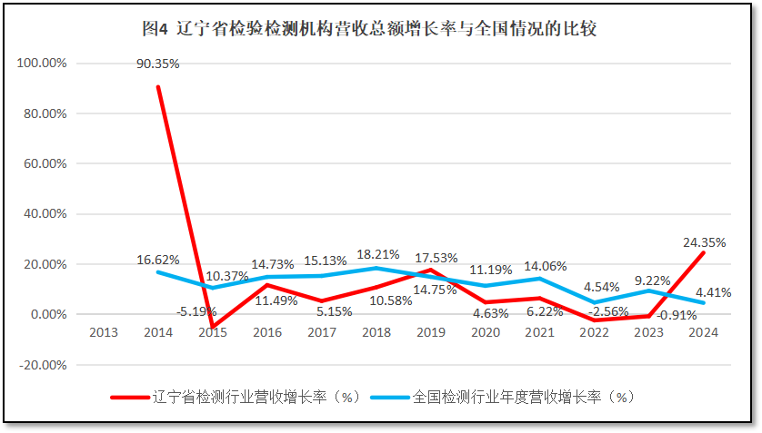 由图4可见,总体来看,除了第一年的离群数据之外,辽宁省检验检测行业年度营收总额的增长率曲线常年在低位运行,仅在2019年和2024年超过全国检验检测机构年度营收增长率。2024年,辽宁省出现了远超全国平均数的增长,一方面原因是东北振兴战略的客观拉动,另一方面原因也是在持续多年的行业收缩后,原本技术能力就比较雄厚的辽宁省检验检测行业终于初步突破收入增长魔障,开始进入新的发展快车道。