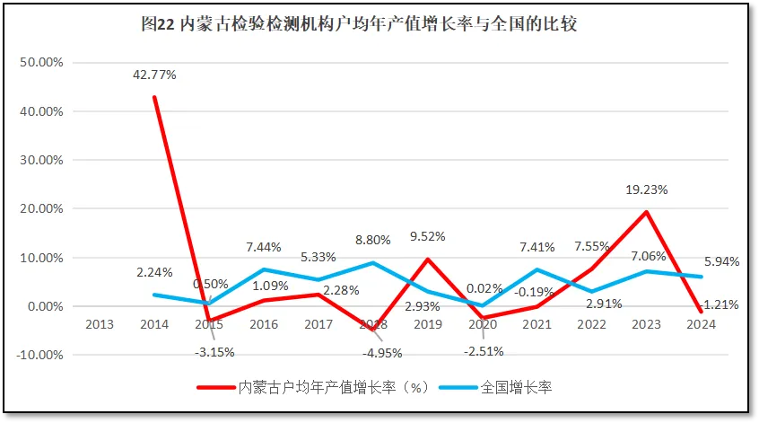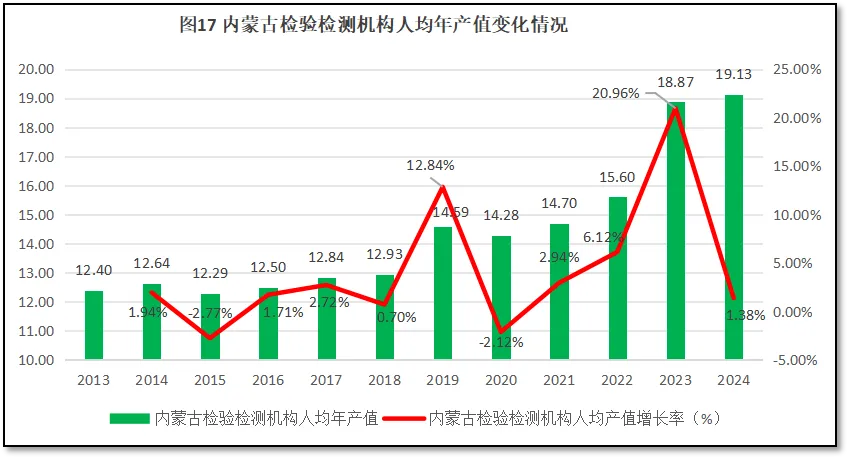 由图19可见,内蒙古自治区检验检测机构人均年产值的增长率除了在2019年、2022年和2023年出现三次相对较高的增幅且增幅大于全国平均数之外,在其他年份均低于全国平均数,且在2015年、2018年以及2020年出现三次比较大的降幅,拉低了内蒙古自治区检验检测机构人均年产值的年均增长率。2024年,内蒙古自治区检验检测机构人均产值的增长率为1.38%,比全国平均数5.18%低了近4个百分点。