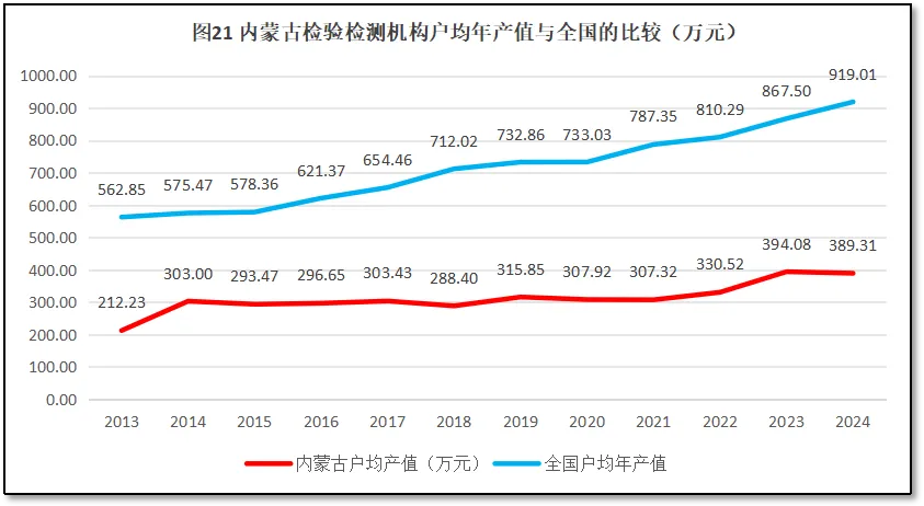 内蒙古自治区检验检测机构户均营业收入与全国情况的比较如图21所示。