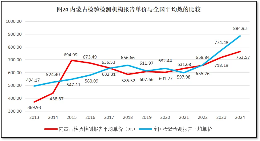 来看内蒙古自治区检验检测报告单价的情况,过去12年内蒙古自治区检验检测报告单价与全国情况的比较如图24所示。