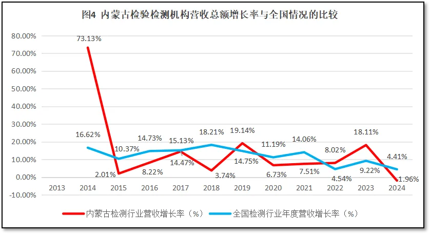 比较内蒙古自治区检验检测行业年度营收总额增长率与全国检验检测行业年度营收总额增长率随时间的变化,如图4所示。