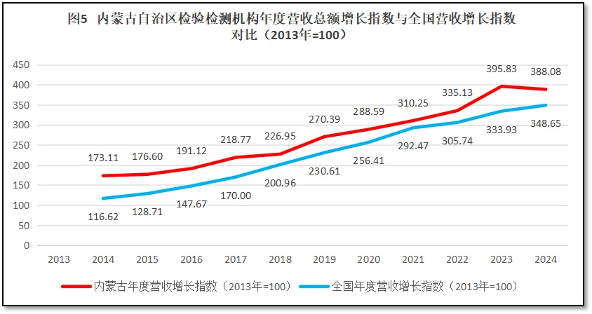 再来看营收总额增长指数的情况,若以2013年检验检测服务业统计制度实施元年的检验检测行业营收总额作为基准100计,内蒙古自治区检验检测行业营收总额增长指数与全国平均情况的比较如图5所示。