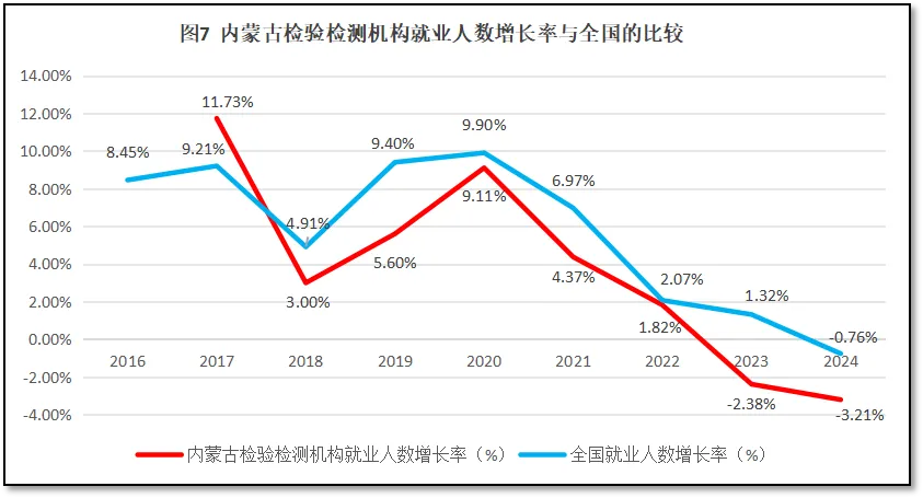 内蒙古自治区检验检测机构就业人数增长率与全国检验检测机构就业人数增长率的比较如图7所示。