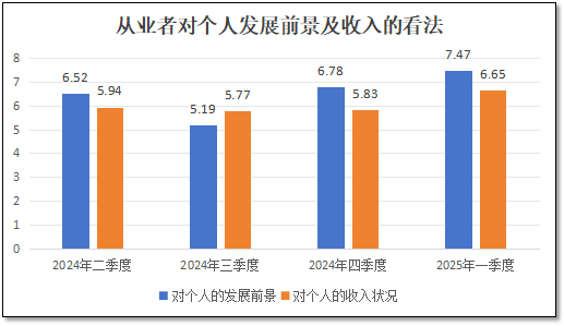 由上两图可见,对于体制机制方面的风险细分项目,2025年一季度风险分值相较上一季度均出现了回落,除了“缺乏激励措施,员工没有积极性”这一分项的分值还比2024年二季度略高之外,其余分项的分值均为四个季度以来的最低值,表明从业者们对体制机制方面的感受也有好转,较为不满意的仍然是管理中缺乏激励措施问题。