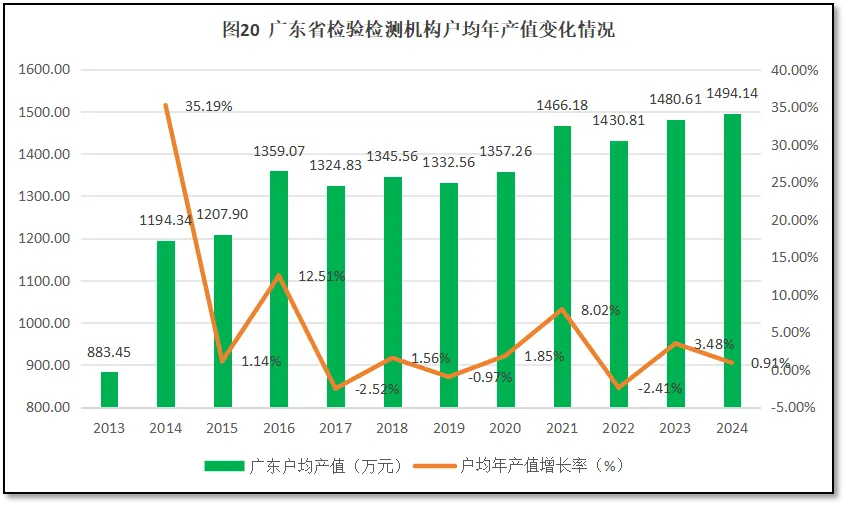 由图23可见,广东省检验检测机构户均出报告数量均高于全国平均水平,说明广东省检验检测机构承接的业务量很大(2021年广东省检验检测机构户均出具报告数量出现一个异常高值,可能存在数据误差)。