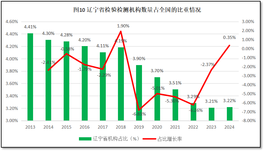 由图10可见,辽宁省检验检测机构数量在全国检验检测机构总数中的占比呈现逐年下降的趋势,从2013年的4.41%逐渐下降到2024年的3.22%。从增长率的变化情况来看,除了2018年和2024年短暂出现正增长之外,其余年份辽宁省检验检测机构数量的占比都处于负增长,年均增幅为-2.78%。2024年辽宁省占比出现的微弱增长,占比增幅为0.35%,这一增加并非辽宁省检验检测机构数量增加导致,而是全国检验检测行业规模降幅过大引起的。